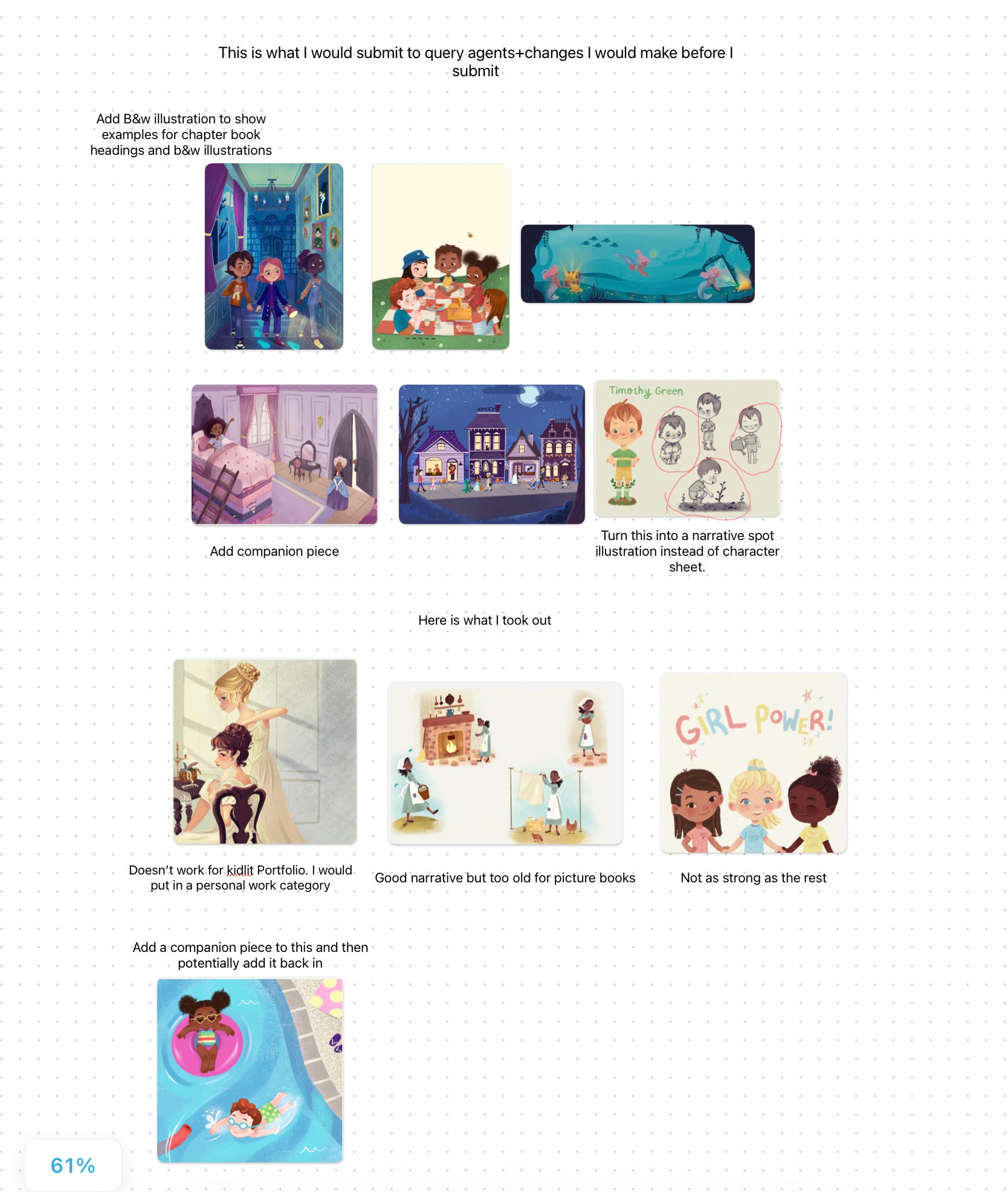 Remember this is just my opinion and I still have work to do on my current portfolio. I did get an agent with the work I submitted. As I see it, if I had refined it a bit I might’ve shortened my querying process.