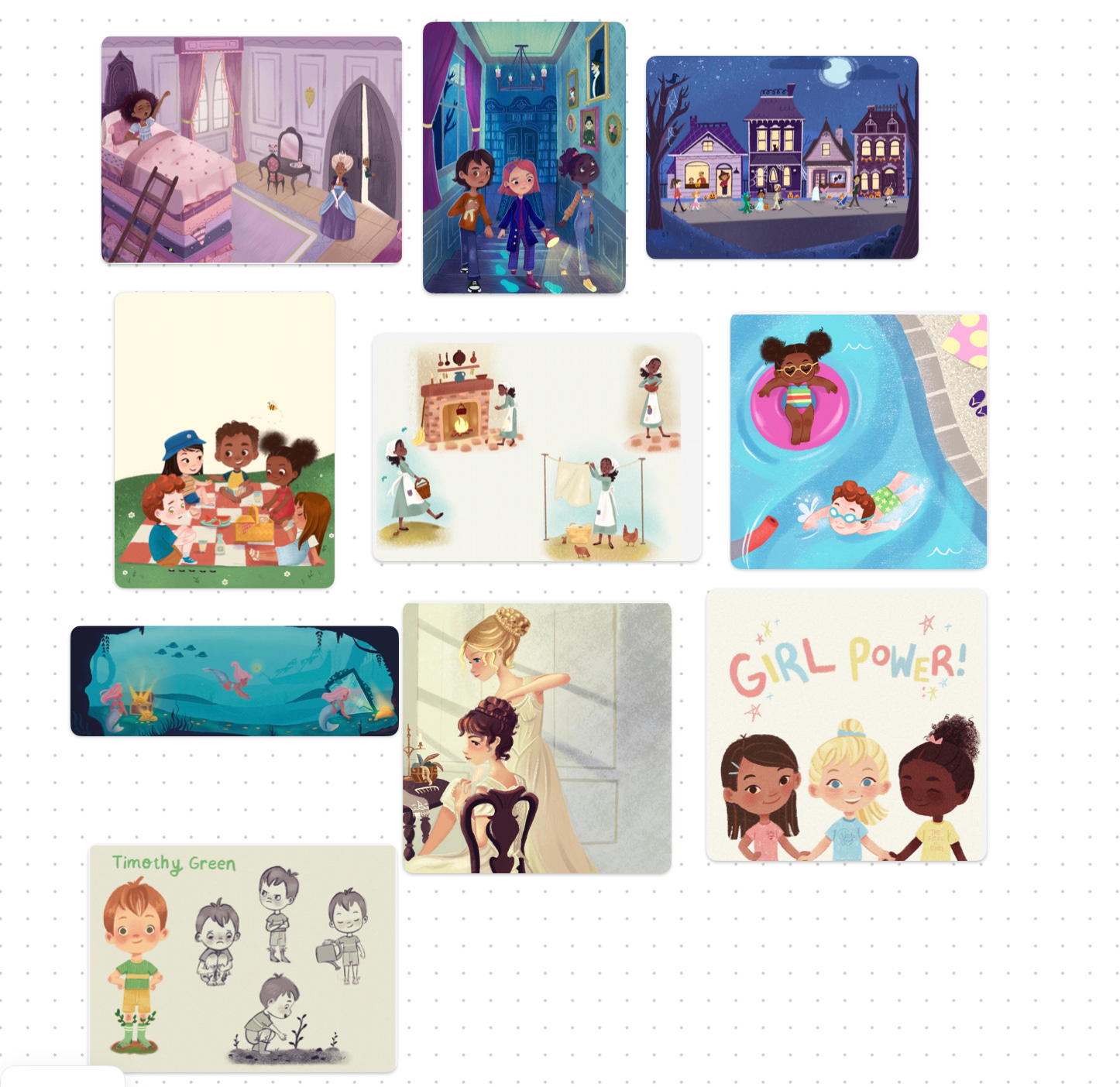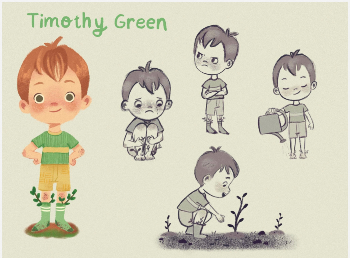 Last two, I was grasping at straws here you could tell. I think I would cut this one out now. Giving less examples and showing a stronger body of work is better in the end, less is more. The last one is a character design of Timothy Green, I love the story and the idea to use him for a picture book but a character sheet isn’t really something you need for a picture book portfolio. Unless it’s for your own reference. To make this a better fit, I would take a couple of my favorites and make spot illustrations instead. It will still show you can repeat characters but now it has more narrative.