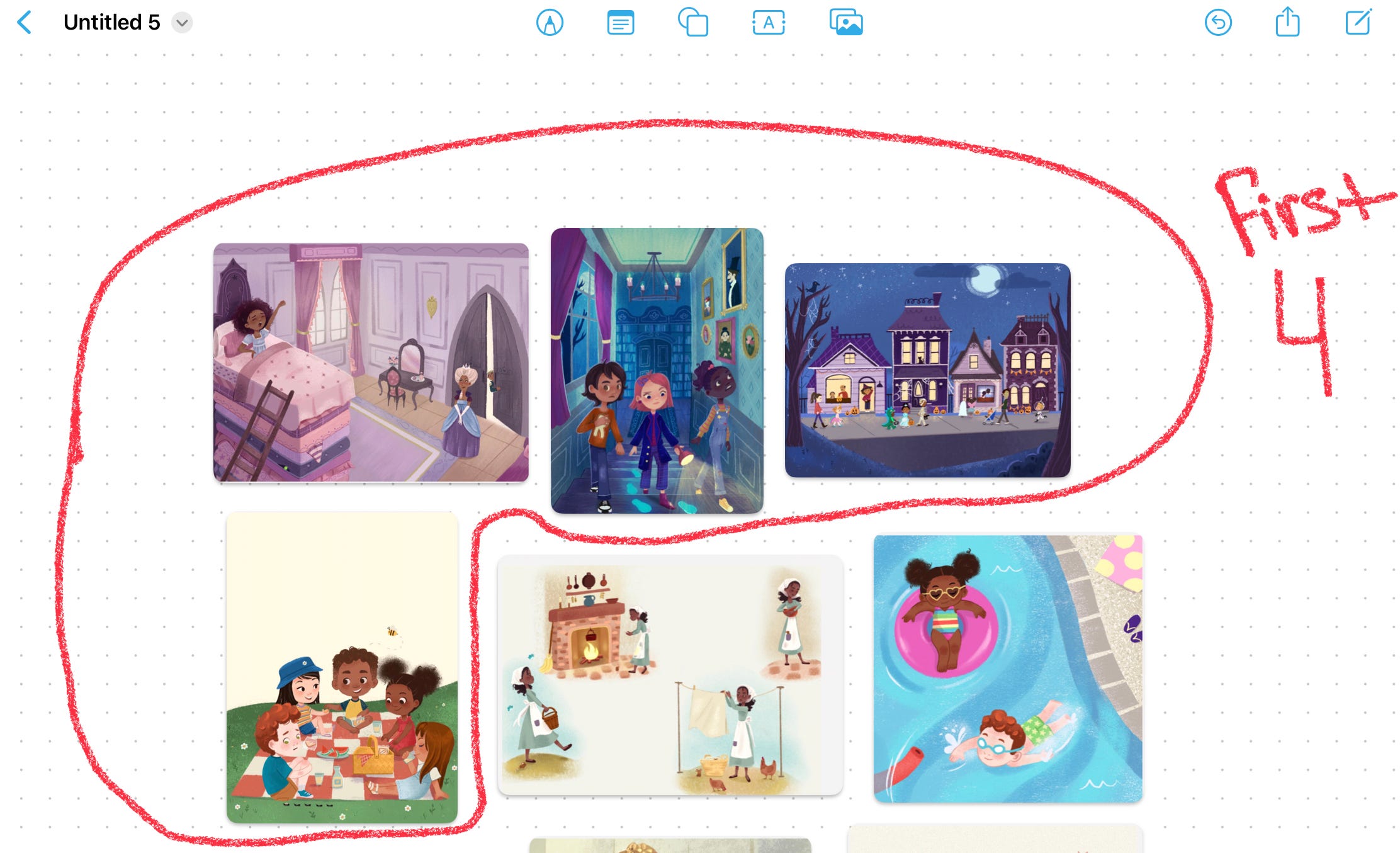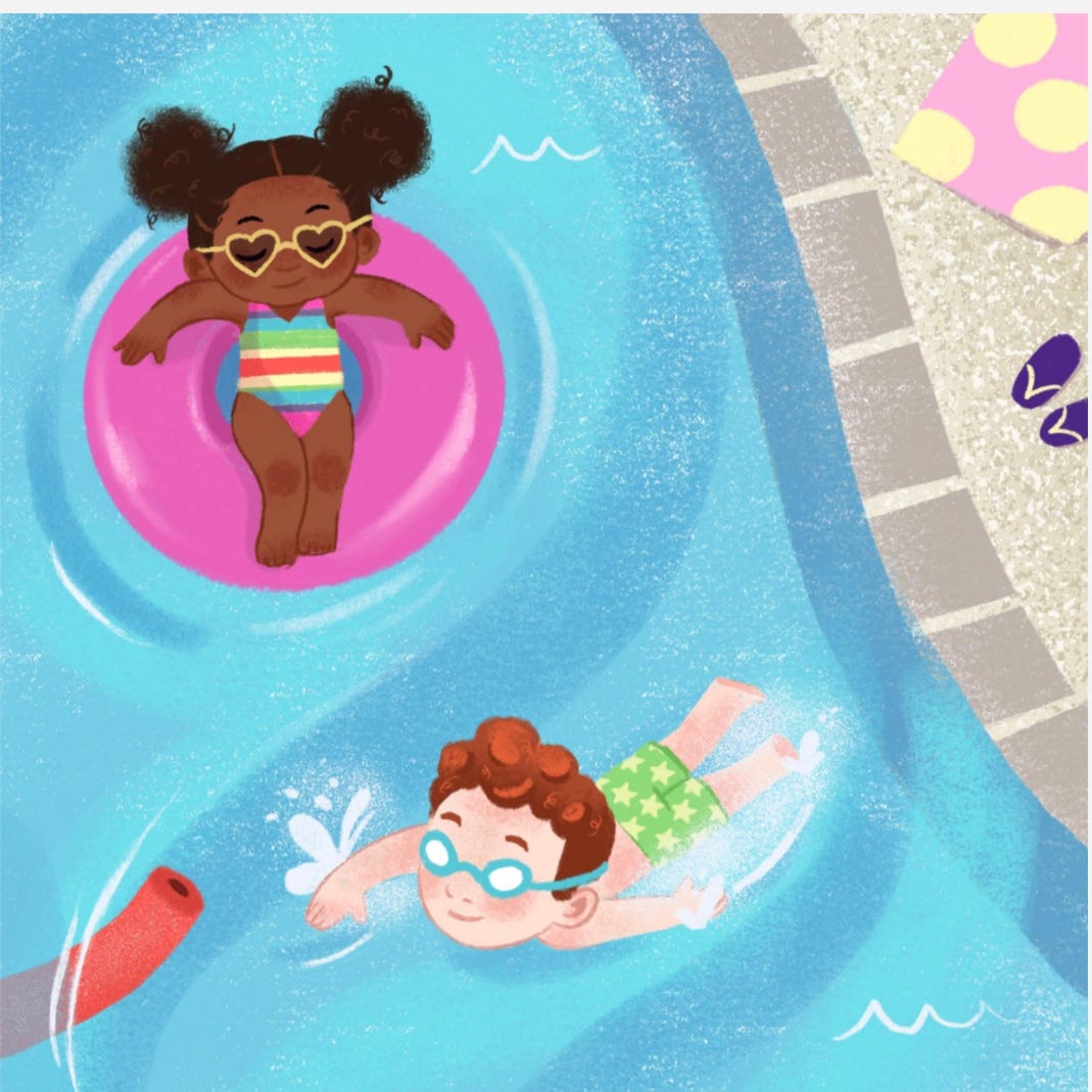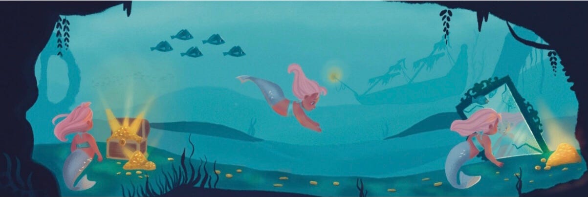 Now let’s get into the next illustrations, these two are good the first one shows some kids playing in the pool interacting with the environment. I think a piece to go along with this would be good what happens before or after this moment? The following is a great example of a spread illustration I’m showing the mermaid character looking for treasure she’s reoccurring and leads your eye through the page. Still very fond of this spread.