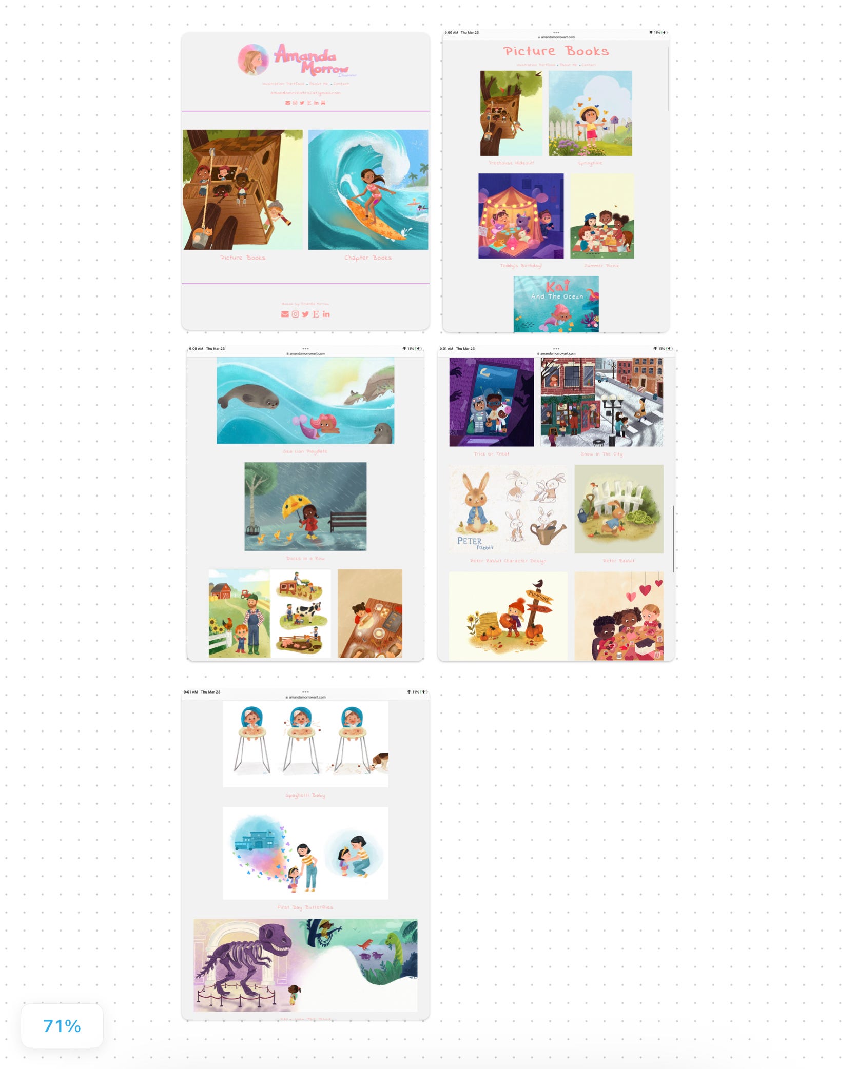 This is my current illustration portfolio it’s not perfect, but it has gotten me work. The number one thing I recommend is having your own professional website with your own domain. I use Carrd it was super easy and pretty inexpensive especially compared to other website host platforms. Other free options are Behance, Wix the free version, or Tumblr, or Wordpress if you know how to code. You just need a space where you can showcase the best of the best of your work. I have it sectioned into picture book work and chapter books.